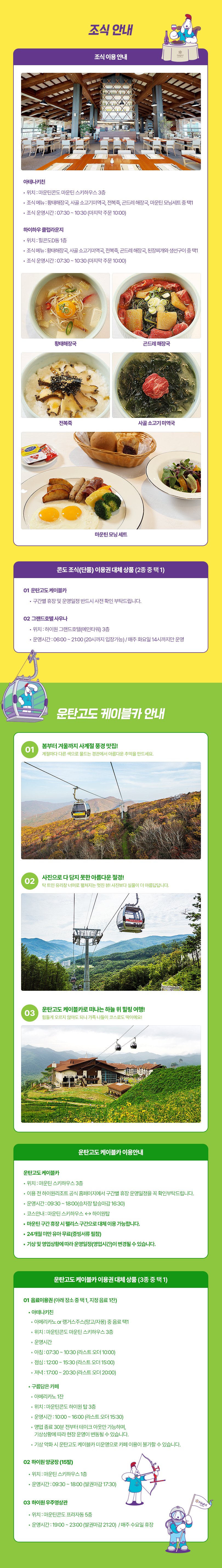 - 조식 메뉴 : 황태해장국, 사골 소고기미역국, 전복죽, 곤드레 해장국, 마운틴 모닝세트 중 택1